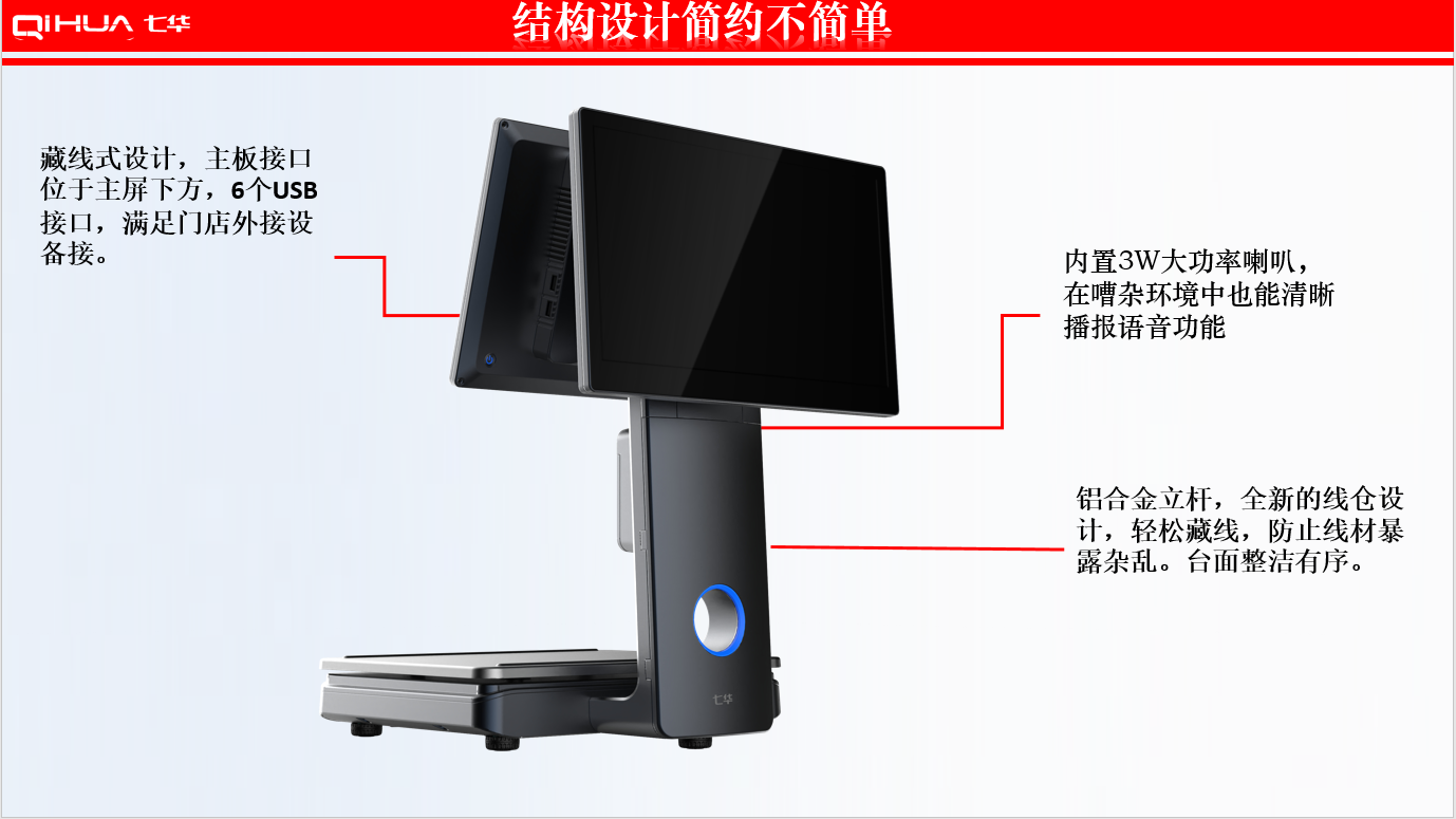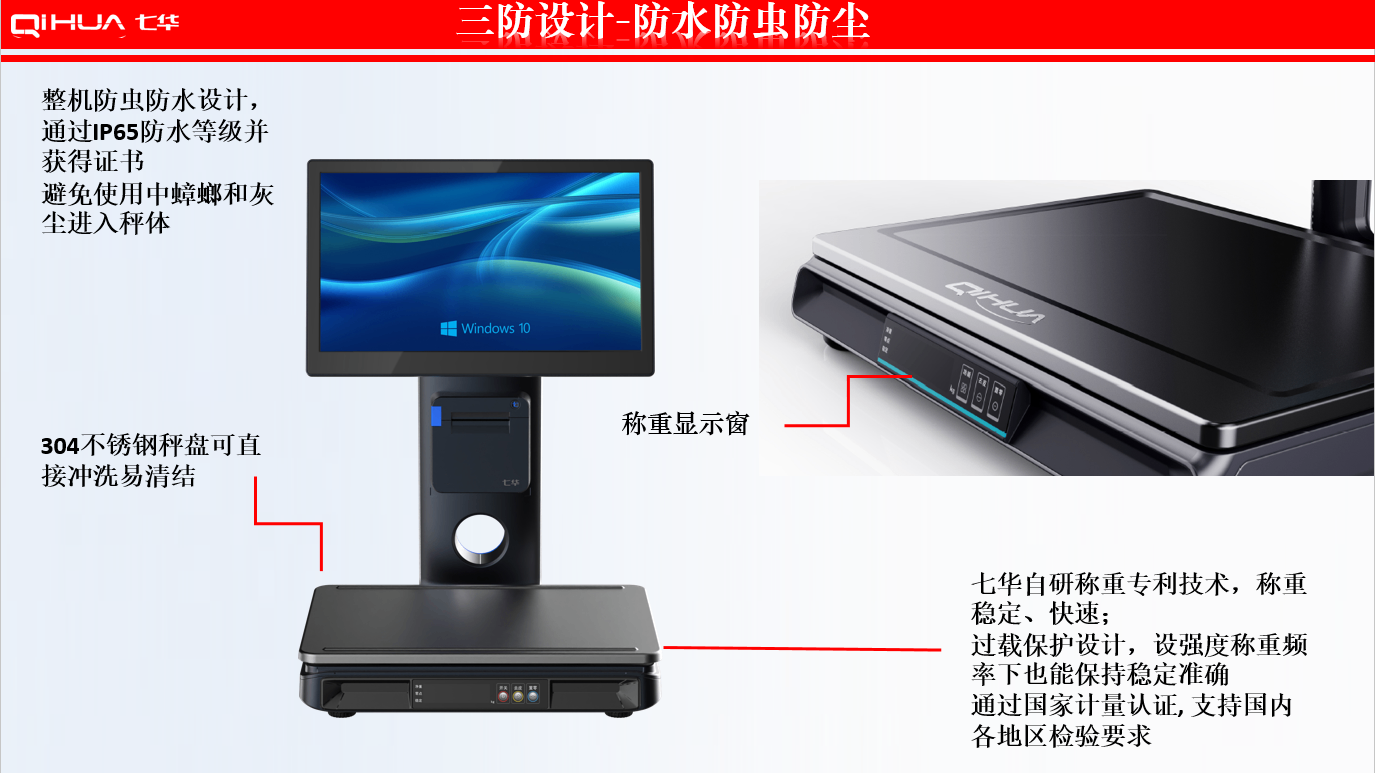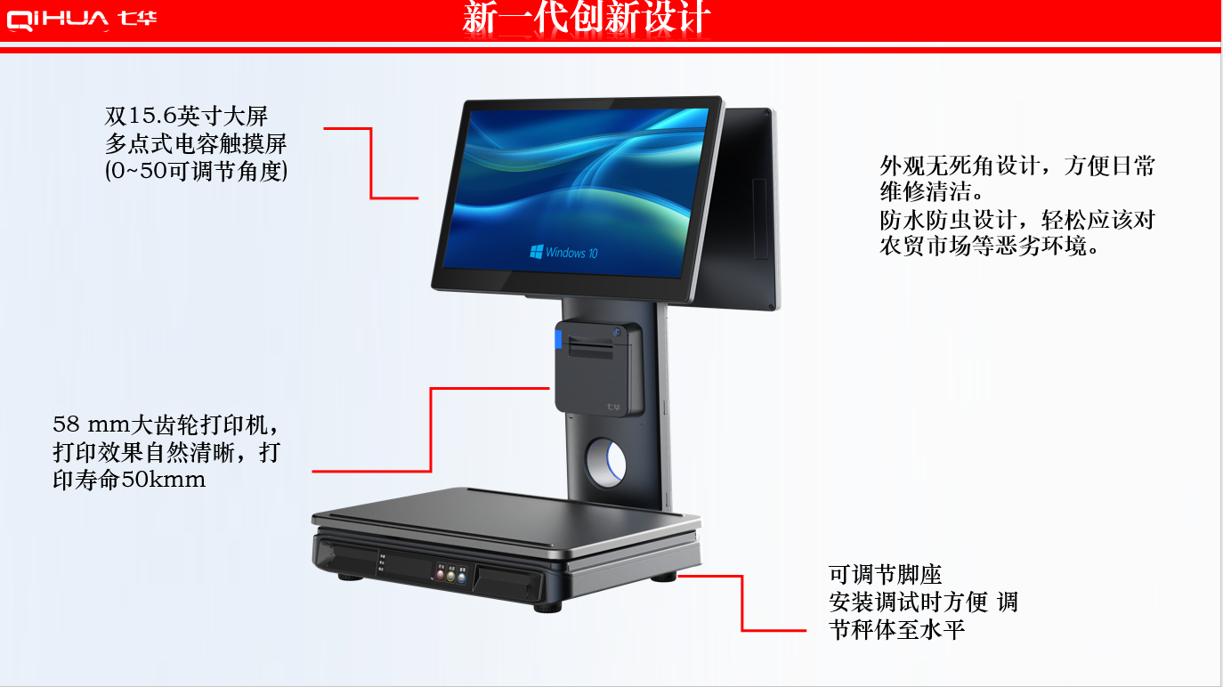 描述:新一代創(chuàng)新設(shè)計,雙15.6英寸大屏,多點(diǎn)式電容觸摸屏可(0~50可調(diào)節(jié)角度)。鋁合金立桿,全新的線倉設(shè)計,輕松藏線,防止線材暴露雜亂。臺面整潔有序。七華自研稱重專利技術(shù),稱重穩(wěn)定、快速;過載保護(hù)設(shè)計,設(shè)強(qiáng)度稱重頻率下也能保持穩(wěn)定準(zhǔn)確;通過國家計量認(rèn)證, 支持國內(nèi)各地區(qū)檢驗(yàn)要求。外觀無死角設(shè)計,方便日常維修清潔。 防水防蟲設(shè)計,輕松應(yīng)該對農(nóng)貿(mào)市場等惡劣環(huán)境。
